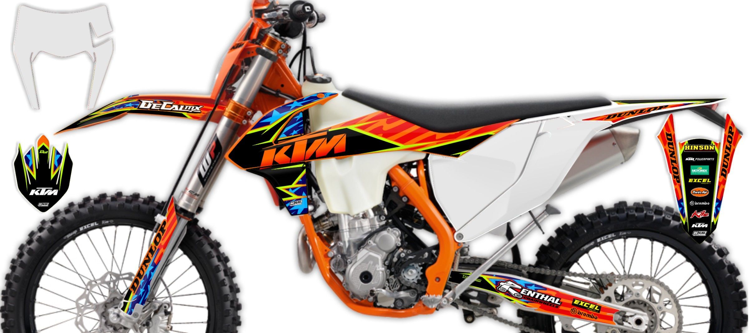 Use the DeCal Works interactive design studio to personalize your very own KTM Orange / Black / Toxic / Blue / Navy Stars And Stripes Ready Made Full Graphics Kit. This kit comes with everything you need to make your bike stand out. Your choice of colors, design, and logos.