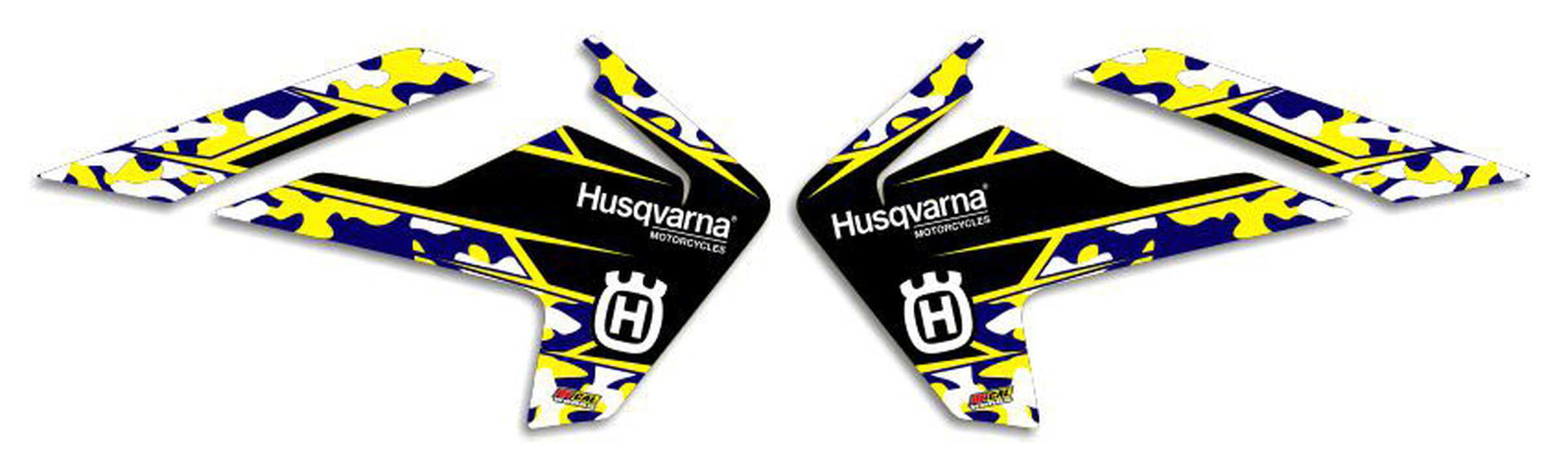 Use the DeCal Works interactive design studio to personalize your very own Husqvarna Navy / Black / Yellow / White Traditional Camo Series Ready Made Full Graphics Kit. This kit comes with everything you need to make your bike stand out. Your choice of colors, design, and logos.