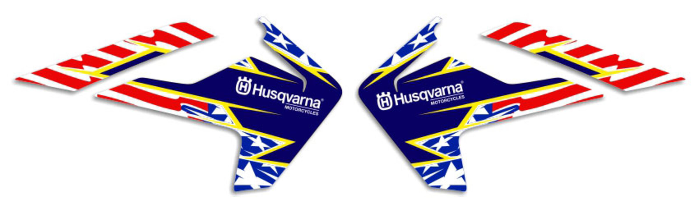 Use the DeCal Works interactive design studio to personalize your very own Husqvarna White / Navy / Yellow / Blue Stars And Stripes Ready Made Rad Graphics Kit. This kit comes with everything you need to make your bike stand out. Your choice of colors, design, and logos.