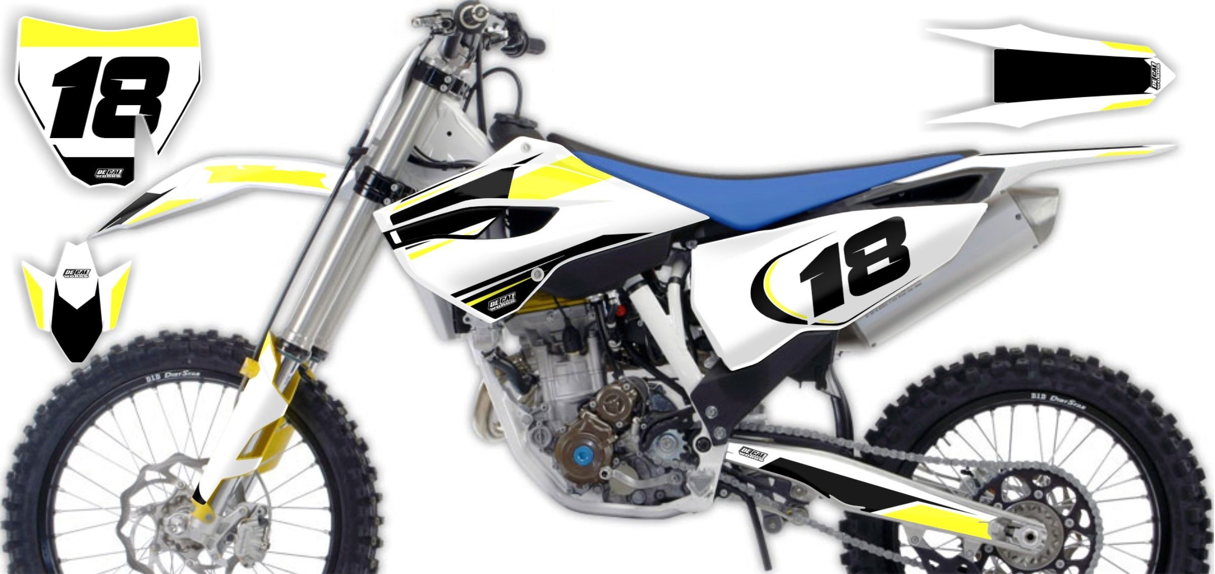 Use the DeCal Works interactive design studio to personalize your very own Husqvarna White / Black / Yellow Husqvarna Factory Series 18 Semi Custom Rad Graphics Kit. This kit comes with everything you need to make your bike stand out. Your choice of colors, design, and logos.