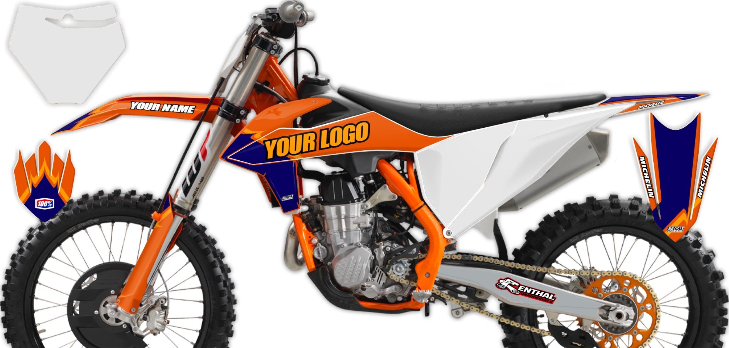 Use the DeCal Works interactive design studio to personalize your very own KTM Orange / Navy / Tangerine T-18 Series Semi Custom Complete Graphics Kit. This kit comes with everything you need to make your bike stand out. Your choice of colors, design, and logos.