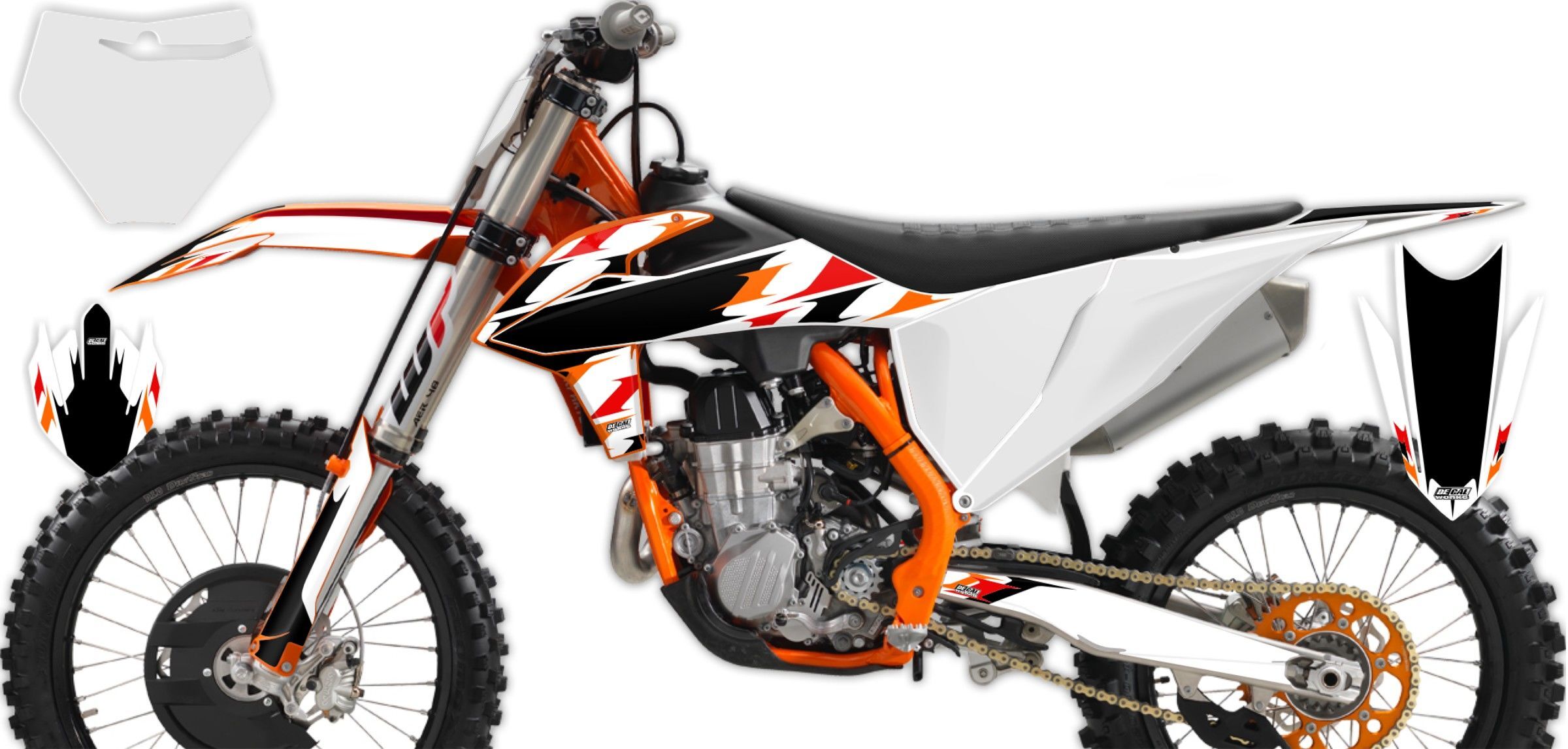 Use the DeCal Works interactive design studio to personalize your very own KTM White / Black / Orange / Red T-6 Series Semi Custom Complete Graphics Kit. This kit comes with everything you need to make your bike stand out. Your choice of colors, design, and logos.