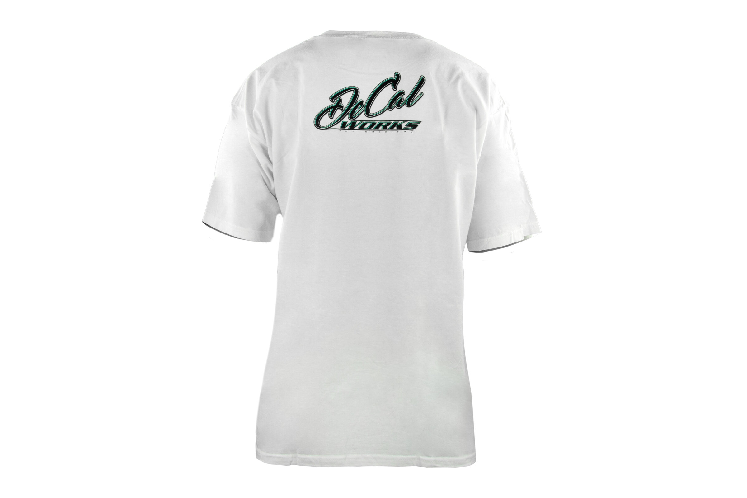 DeCal Works White T-Shirt with Script Back Angle