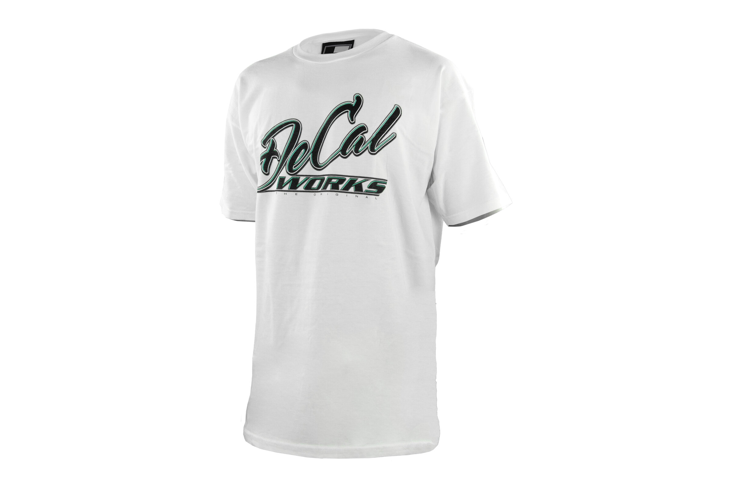 DeCal Works White T-Shirt with Script Angled