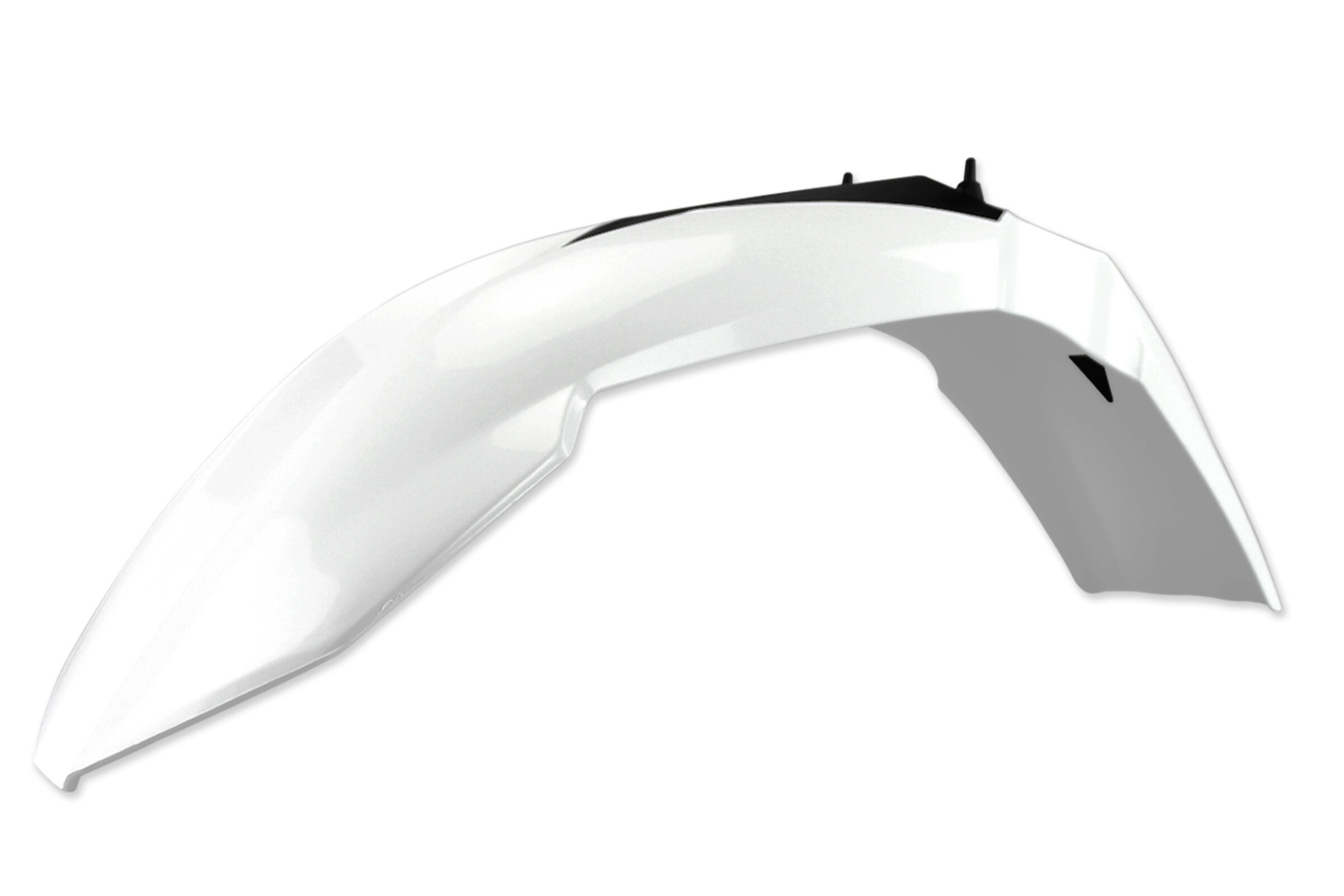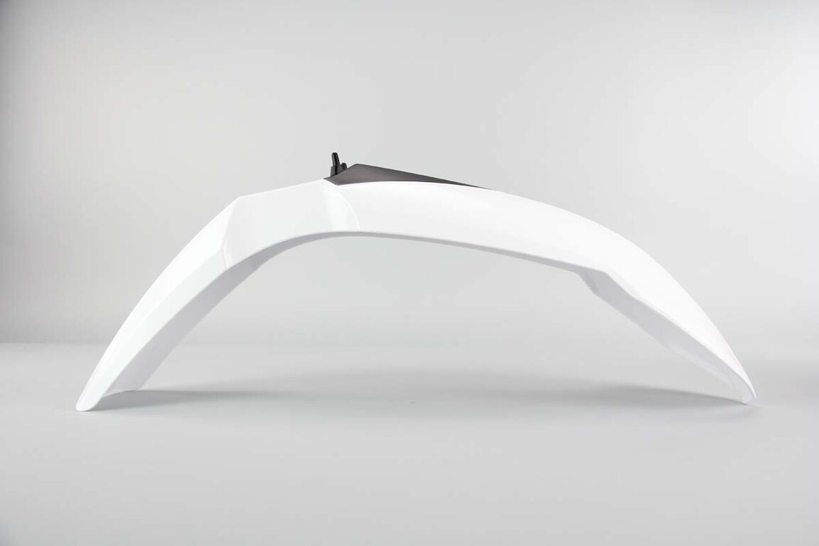 When your original dirt bike plastics need to be replaced, the UFO White Front Fender replacement plastics are an affordable, more durable option and are built to exceed original specifications.