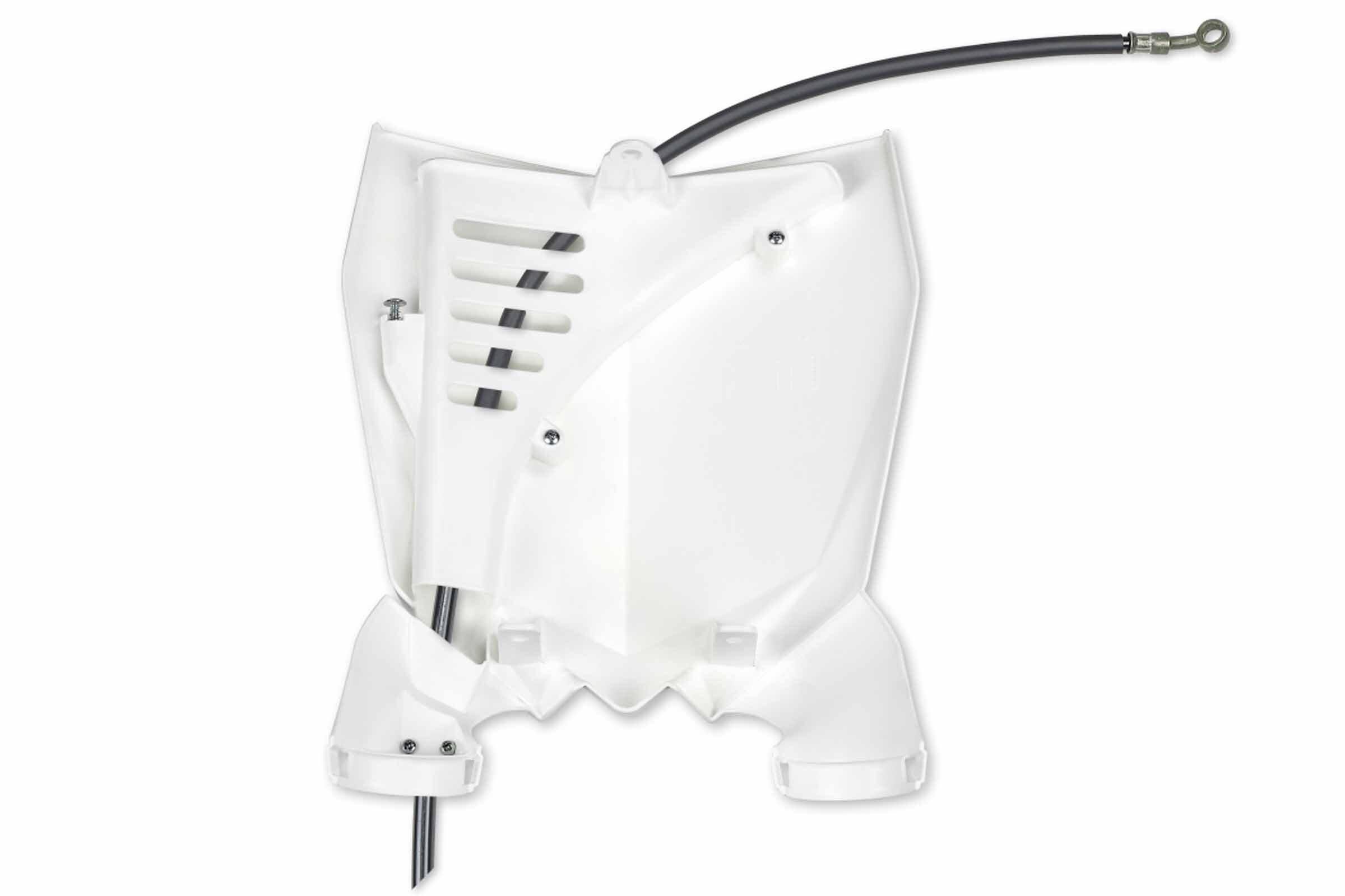 When your original dirt bike plastics need to be replaced, the UFO White Front Number Plate replacement plastics are an affordable, more durable option and are built to exceed original specifications.