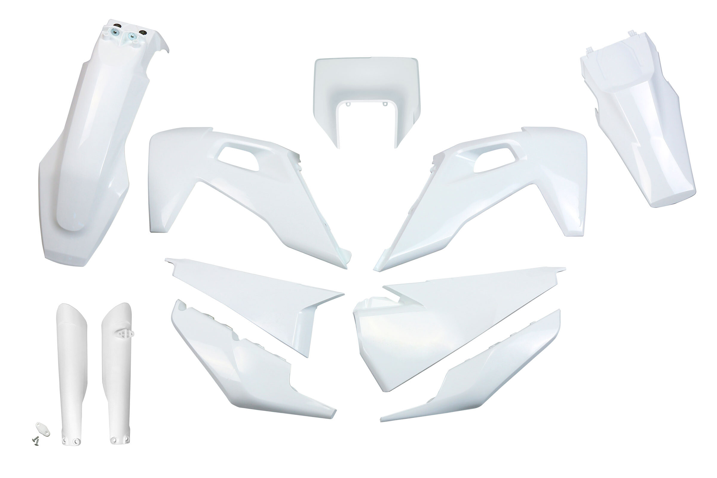 UFO White w/ Forks Plastic Kit for Husqvarna: FE250 (2022-2023), FE350 (2020-2023), FE350s (2020, 2022-2023), FE450 (2020-2023), FE501 (2020-2023), FE501s (2020-2023), TE150 (2023), TE150i (2020-2022), TE250 (2023), TE250i (2020-2022), TE300 (2023), TE300i (2020-2022), TE30...and more