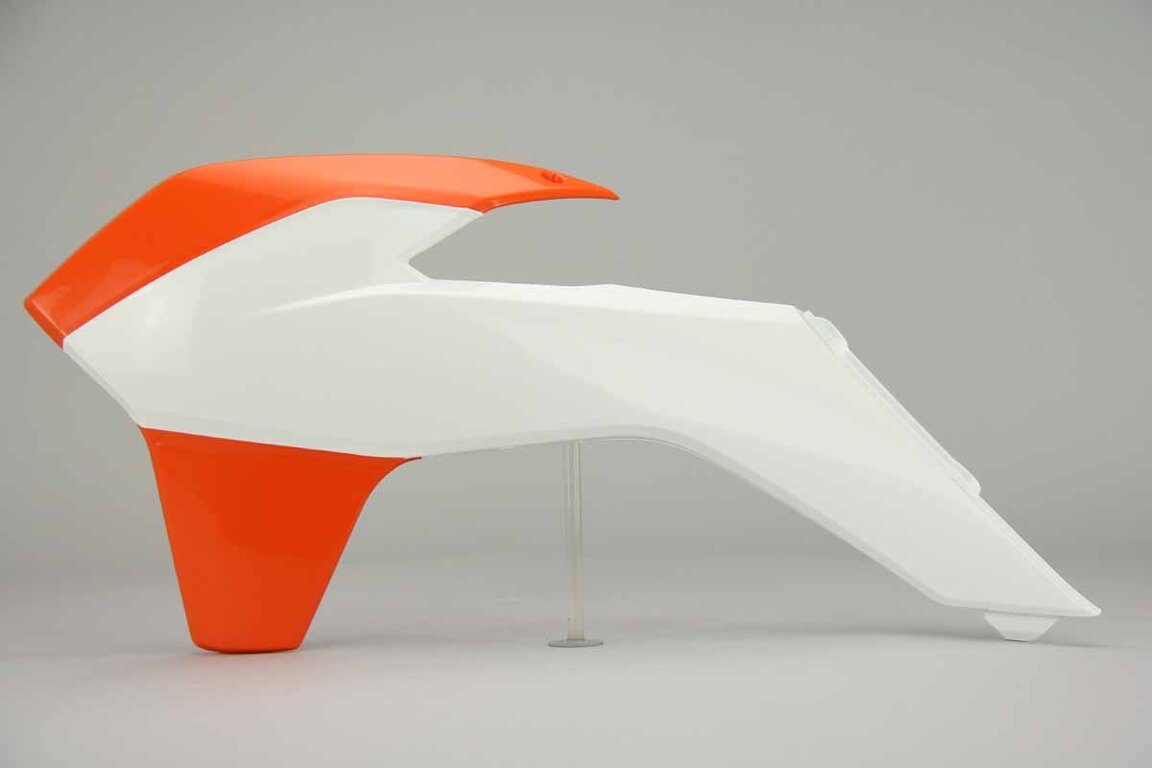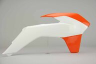 Right Side Polisport White / Orange Radiator Shroud Set replacement plastics for 12-16 KTM EXC, EXCF, SX, SXF, XC, XCF, XCW dirt bikes.