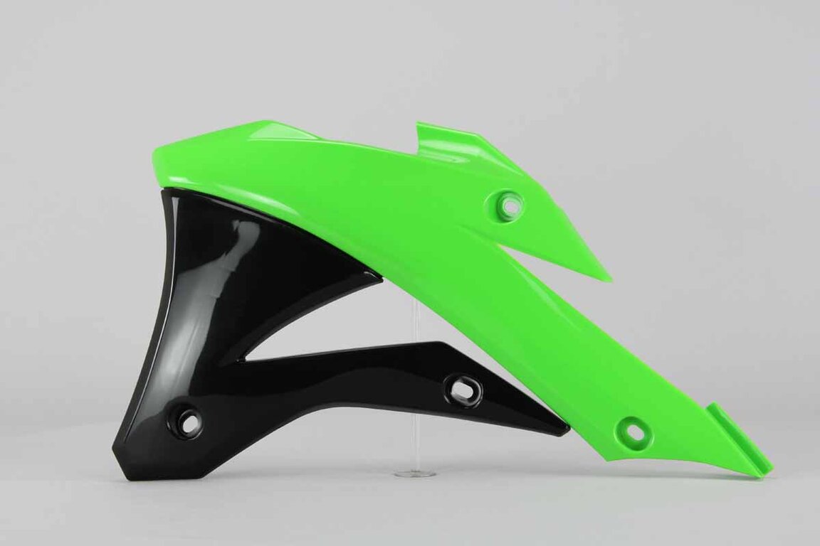 When your original dirt bike plastics need to be replaced, the Polisport Green, Black Radiator Shroud Set replacement plastics are an affordable, more durable option and are built to exceed original specifications.