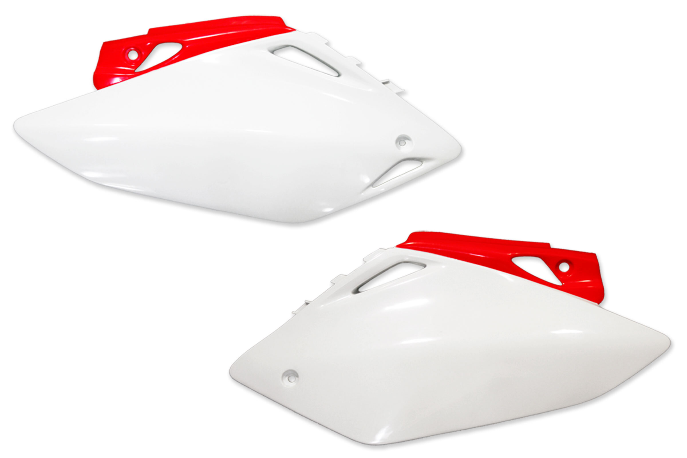 When your original dirt bike plastics need to be replaced, the UFO White, Red Side Number Plates replacement plastics are an affordable, more durable option and are built to exceed original specifications.