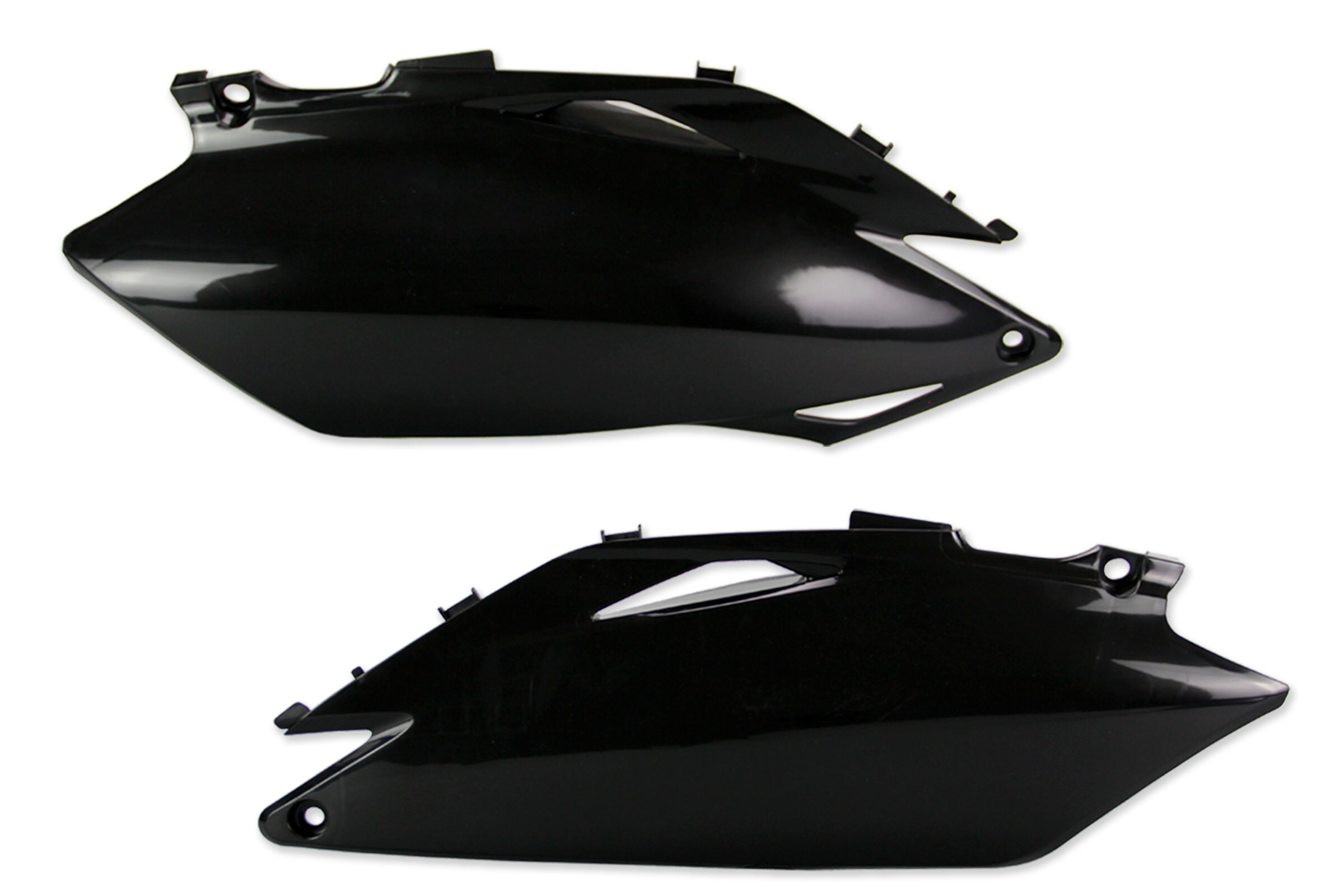 When your original dirt bike plastics need to be replaced, the UFO Black Side Number Plates replacement plastics are an affordable, more durable option and are built to exceed original specifications.