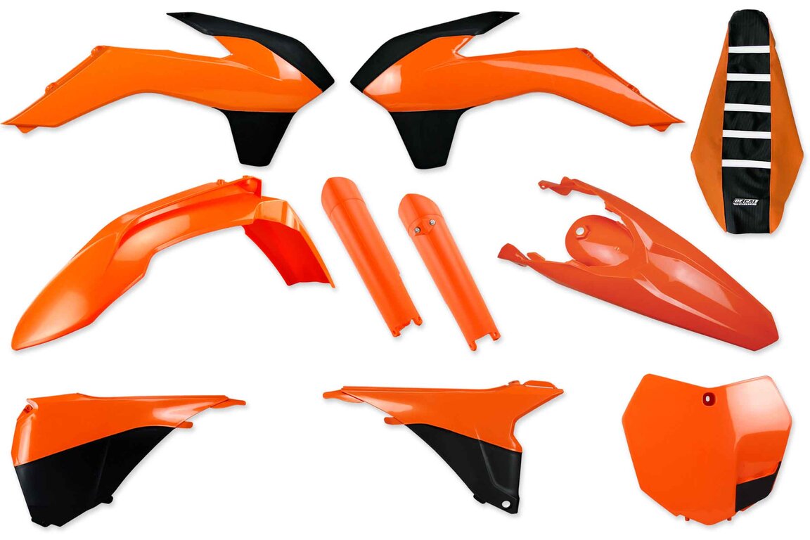 This kit comes complete with everything you need to make your bike look like new. The DeCal Works Mix & Match Color Complete Plastic Kit with Lower Fork Guards and Gripper Seat Cover for your KTM dirt bike allows you to choose each part's color individually to suit your personal style. DeCal Works stocks the largest selection of plastic from top known manufactures including Polisport and UFO. Rest assured, whether you choose Polisport or UFO both manufactures are known for their high resistance, durability, and perfect fit.