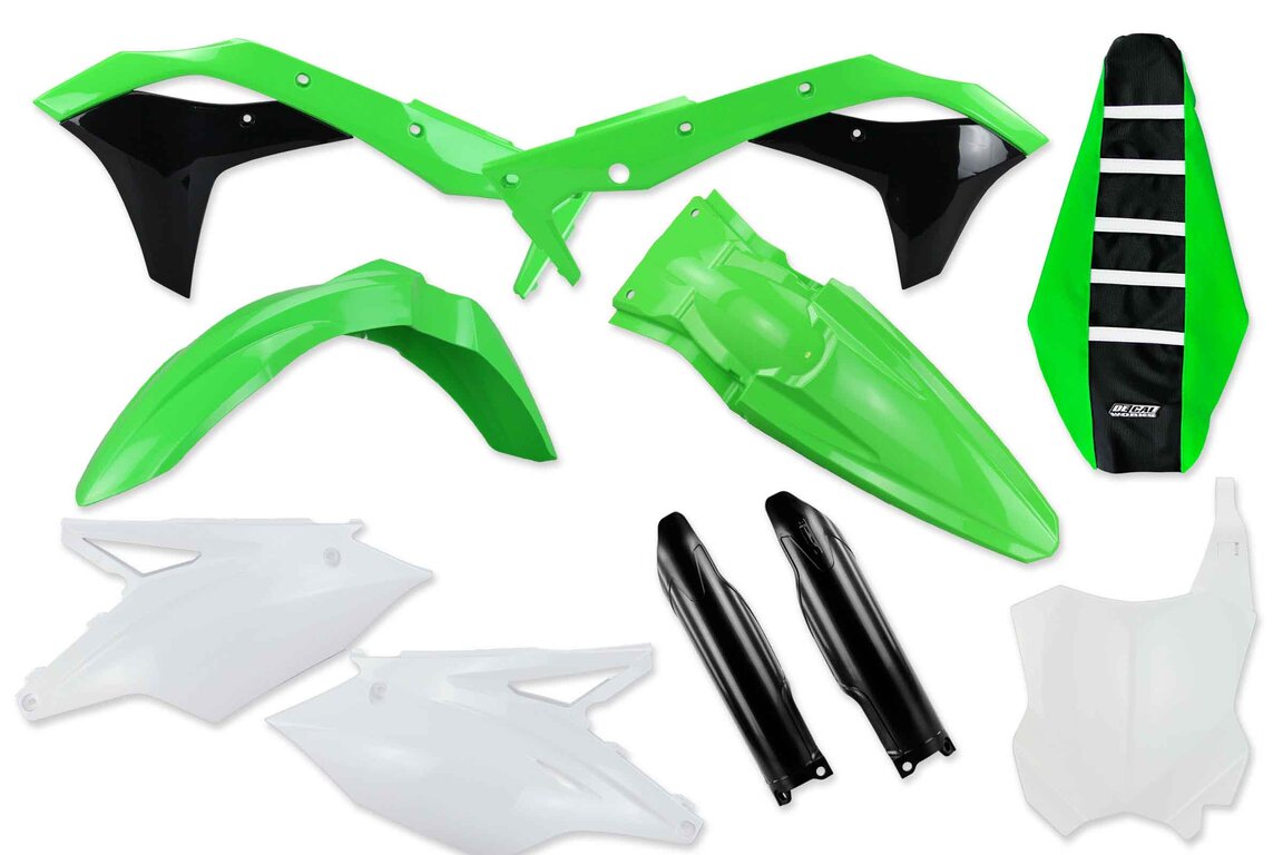 This kit comes complete with everything you need to make your bike look like new. The DeCal Works Mix & Match Color Complete Plastic Kit with Lower Fork Guards and Gripper Seat Cover for your Kawasaki dirt bike allows you to choose each part's color individually to suit your personal style. DeCal Works stocks the largest selection of plastic from top known manufactures including Polisport and UFO. Rest assured, whether you choose Polisport or UFO both manufactures are known for their high resistance, durability, and perfect fit.