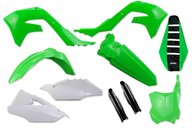 This kit comes complete with everything you need to make your bike look like new. The DeCal Works Mix & Match Color Complete Plastic Kit with Lower Fork Guards and Gripper Seat Cover for your Kawasaki dirt bike allows you to choose each part's color individually to suit your personal style. DeCal Works stocks the largest selection of plastic from top known manufactures including Polisport and UFO. Rest assured, whether you choose Polisport or UFO both manufactures are known for their high resistance, durability, and perfect fit.