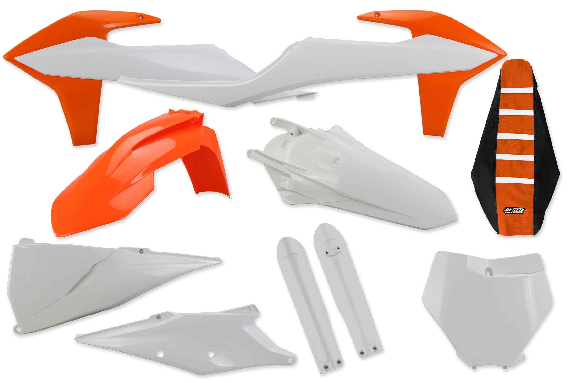 This kit comes complete with everything you need to make your bike look like new. The DeCal Works Mix & Match Color Complete Plastic Kit with Lower Fork Guards and Gripper Seat Cover for your KTM dirt bike allows you to choose each part's color individually to suit your personal style. DeCal Works stocks the largest selection of plastic from top known manufactures including Polisport and UFO. Rest assured, whether you choose Polisport or UFO both manufactures are known for their high resistance, durability, and perfect fit.