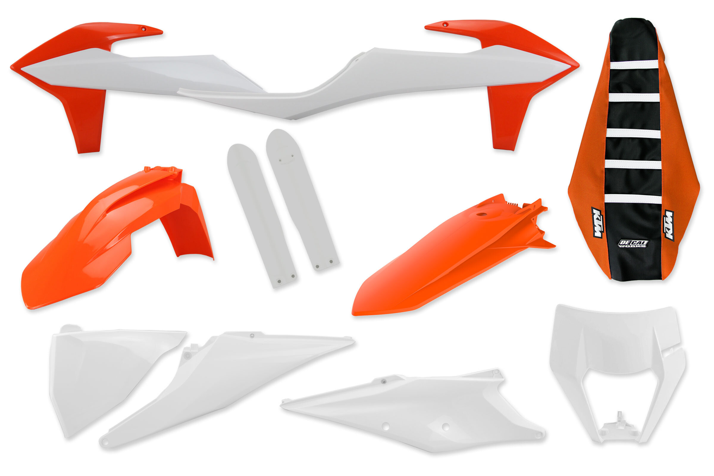 This kit comes complete with everything you need to make your bike look like new. The DeCal Works Mix & Match Color Complete Plastic Kit with Lower Fork Guards and Gripper Seat Cover for your KTM dirt bike allows you to choose each part's color individually to suit your personal style. DeCal Works stocks the largest selection of plastic from top known manufactures including Polisport and UFO. Rest assured, whether you choose Polisport or UFO both manufactures are known for their high resistance, durability, and perfect fit.