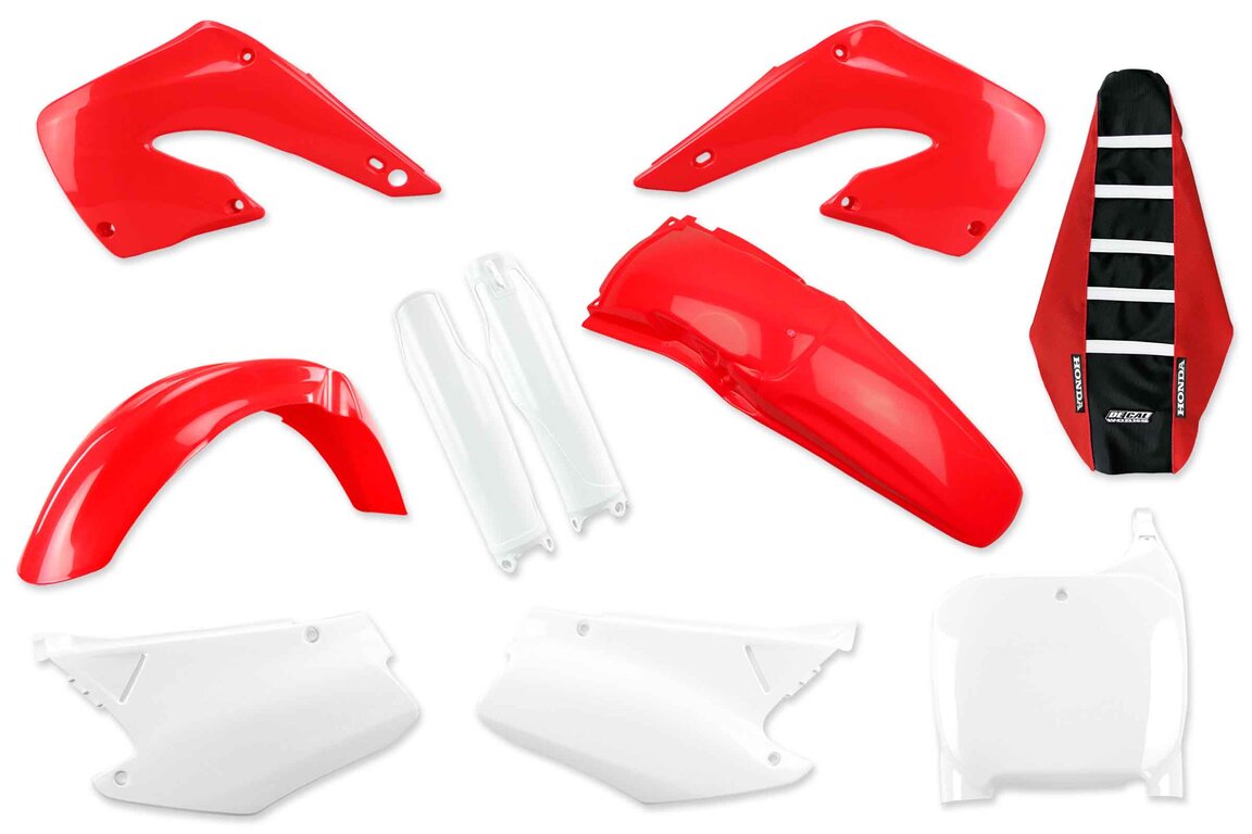 This kit comes complete with everything you need to make your bike look like new. The DeCal Works Mix & Match Color Complete Plastic Kit with Lower Fork Guards and Gripper Seat Cover for your Honda dirt bike allows you to choose each part's color individually to suit your personal style. DeCal Works stocks the largest selection of plastic from top known manufactures including Polisport and UFO. Rest assured, whether you choose Polisport or UFO both manufactures are known for their high resistance, durability, and perfect fit.