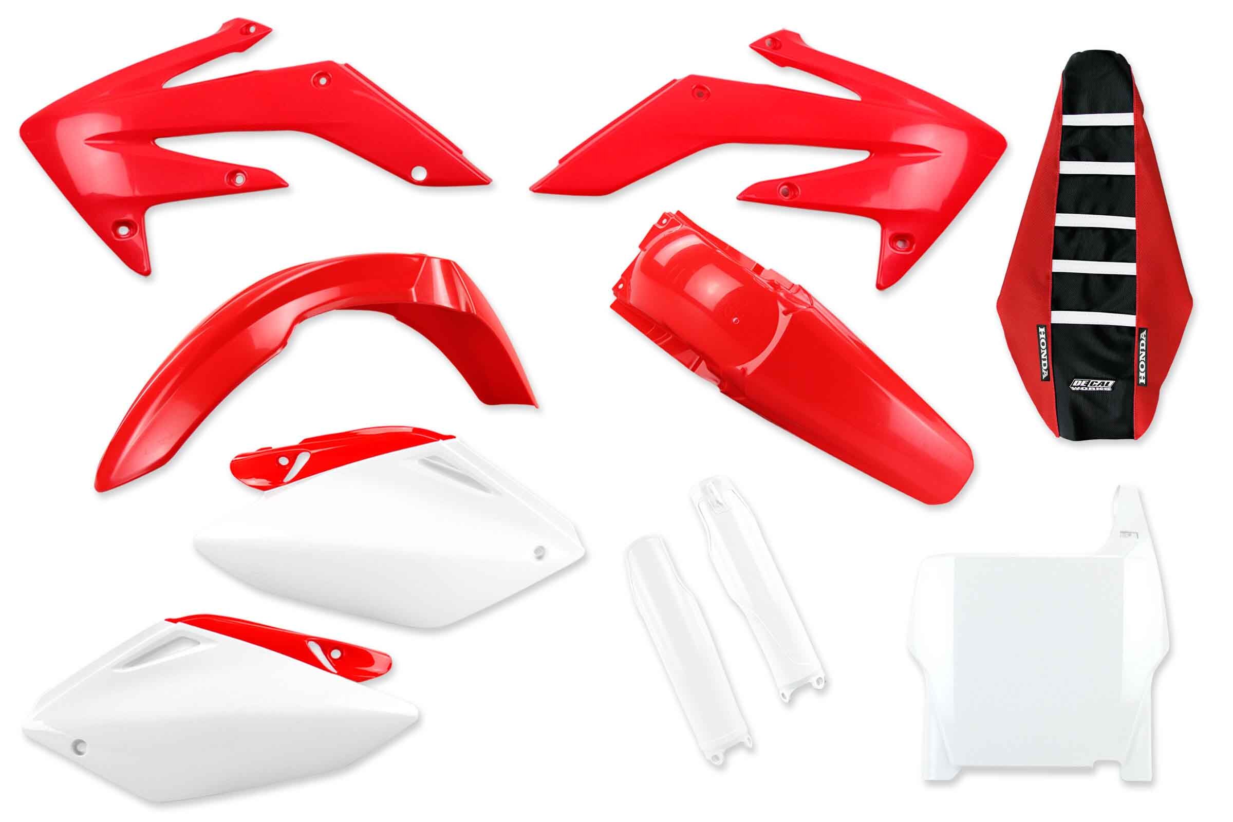 This kit comes complete with everything you need to make your bike look like new. The DeCal Works Mix & Match Color Complete Plastic Kit with Lower Fork Guards and Gripper Seat Cover for your Honda dirt bike allows you to choose each part's color individually to suit your personal style. DeCal Works stocks the largest selection of plastic from top known manufactures including Polisport and UFO. Rest assured, whether you choose Polisport or UFO both manufactures are known for their high resistance, durability, and perfect fit.
