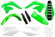 This kit comes complete with everything you need to make your bike look like new. The DeCal Works Mix & Match Color Complete Plastic Kit with Lower Fork Guards and Gripper Seat Cover for your Kawasaki dirt bike allows you to choose each part's color individually to suit your personal style. DeCal Works stocks the largest selection of plastic from top known manufactures including Polisport and UFO. Rest assured, whether you choose Polisport or UFO both manufactures are known for their high resistance, durability, and perfect fit.