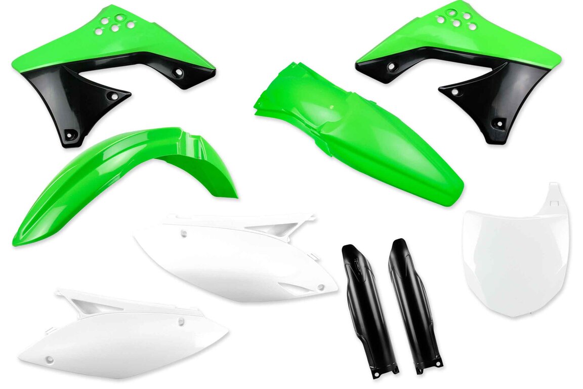 The DeCal Works Mix & Match Color Complete Plastic Kit with Lower Fork Guards for your Kawasaki dirt bike allows you to choose each part's color individually to suit your personal style. DeCal Works stocks the largest selection of plastic from top known manufactures including Polisport and UFO. Rest assured, whether you choose Polisport or UFO both manufactures are known for their high resistance, durability, and perfect fit.