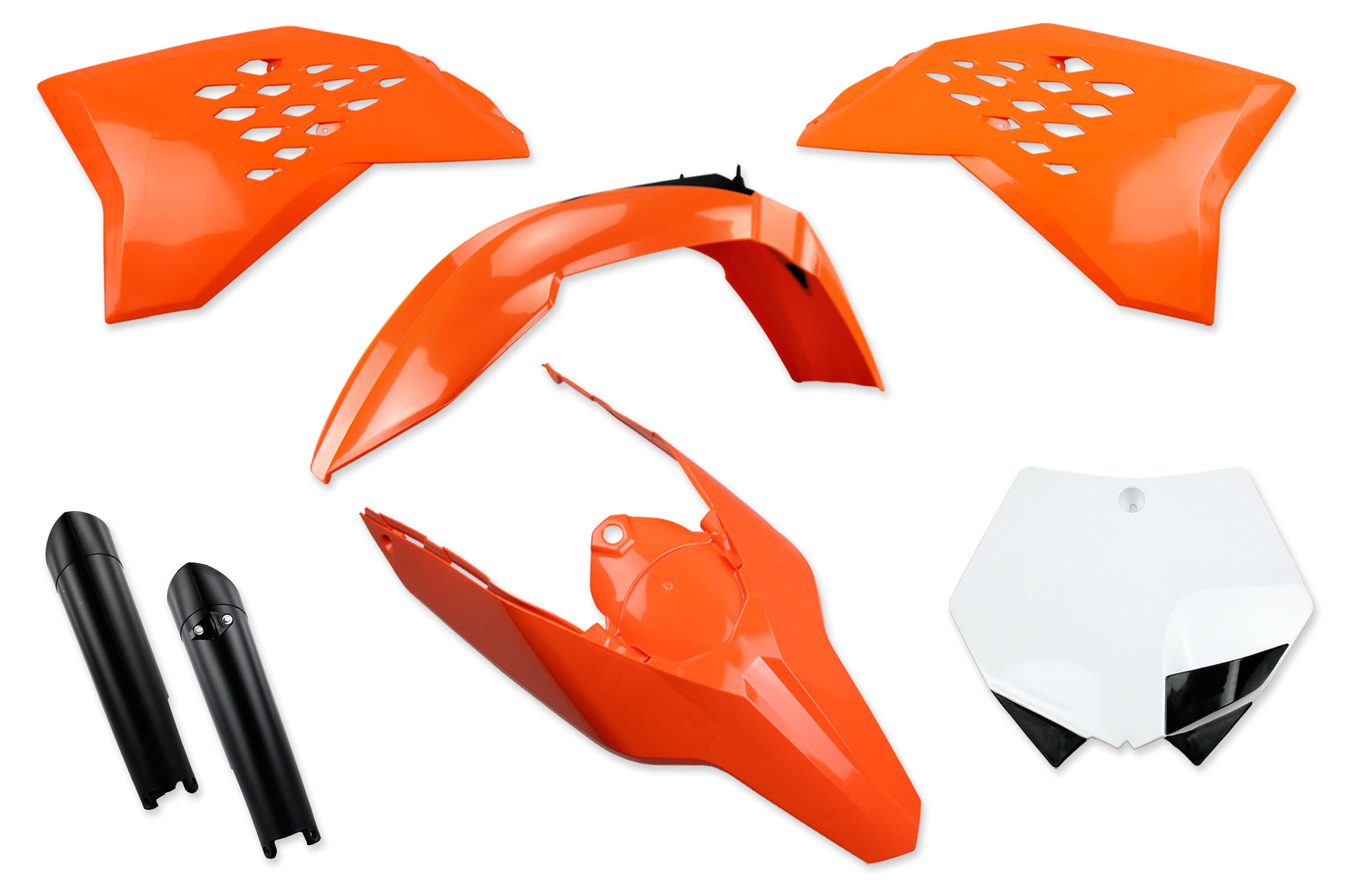The DeCal Works Mix & Match Color Complete Plastic Kit with Lower Fork Guards for your KTM dirt bike allows you to choose each part's color individually to suit your personal style. DeCal Works stocks the largest selection of plastic from top known manufactures including Polisport and UFO. Rest assured, whether you choose Polisport or UFO both manufactures are known for their high resistance, durability, and perfect fit.